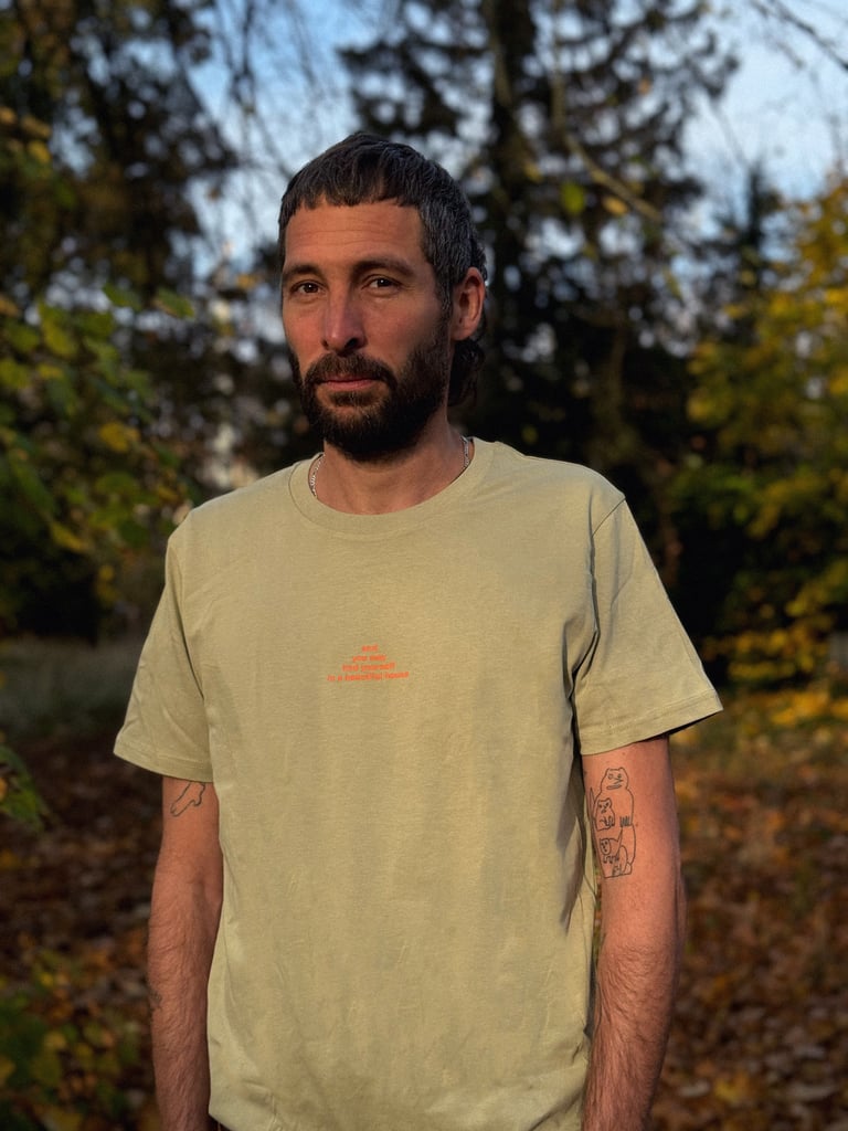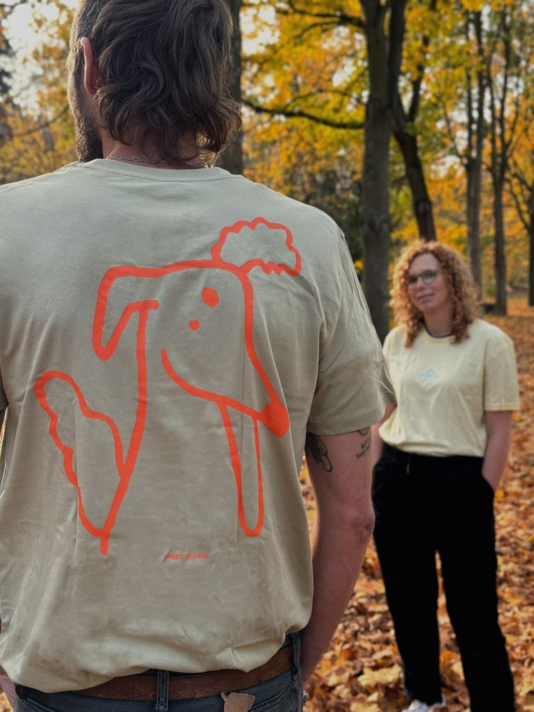 You may find yourself. That’s what we hope for you! Maybe for now in a beautiful shirt from Doggo Donate. It’s the perfect starting point for you and for the strays. A real statement piece with a bold back print featuring a quirky dog—a beautiful weirdo just like you. And with some thought-provoking words on the chest.