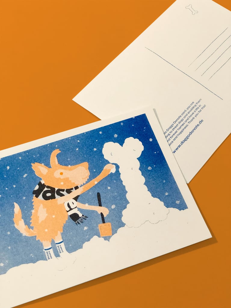 We taught this good boi a new trick. It´s building snow bones to impress you and get you to buy this supernice and thick riso print card. Look at these colors! And once you have it write some nice words on it and give it to your loved ones. It´s so easy to do good!